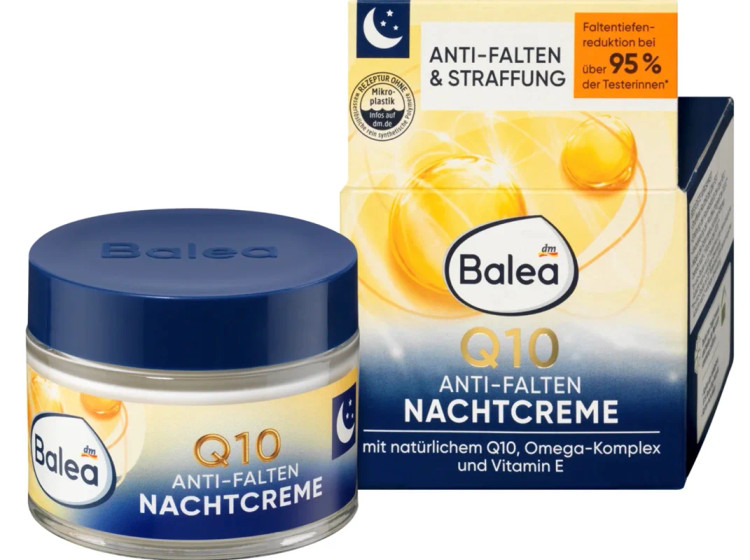 مراقبت سفت کننده: Balea Q10 چین و چروک ها و عمق چین و چروک ها را کاهش می دهد. Q10 تامین کننده انرژی موثر برای سلول ها است. به طور فعال به بازسازی پوست کمک می کند. امگا کمپلکس سرشار از اسیدهای چرب ضروری است و انعطاف پذیری پوست را زیاد می کند. ویتامین E از پوست در برابر رادیکال های آزاد محافظت می کند و پروویتامین B5 رطوبت شدیدی برای آن فراهم می کند.