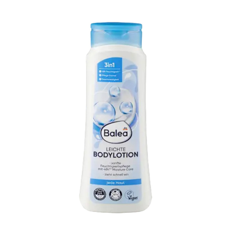 لوسیون بدن سبک Balea به پوست حس آرامش و راحتی ماندگار میدهد – برای مراقبت روزانه. این لوسیون به طور قابل اعتمادی پوست معمولی را مرطوب میکند و هر روز حس نرمی و لطافت مخملی به آن میدهد. فرمول ۴۸ ساعته Moisture Care از تامین رطوبت طبیعی پوست پشتیبانی میکند و فرمول متعادل آن، پوست را تغذیه و از خشکی محافظت میکند. ویتامین E و روغن آفتابگردان نیز آن را تغذیه میکنند. امولسیون سبک آن به راحتی پخش میشود و به سرعت جذب میشود. این فرمول فاقد میکروپلاستیک و پلیمرهای کاملاً مصنوعی محلول در آب است.