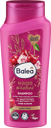 شامپو Warm Wishes از Balea لحظاتی از آرامش را به شما هدیه می دهد. تجربه عطر دلپذیر با رایحه گیلاس و گل رز مراقبت از موهای شما را مسحور می کند. این شامپو به لطف مجموعه ساختمانی با ویتامین B3 و پروویتامین B5 مو را تغذیه می کند. فرمولاسیون بدون میکروپلاستیک و پلیمرهای کاملا مصنوعی محلول در آب." *بسته بندی حاوی حداقل 70 درصد محتوای بازیافتی است